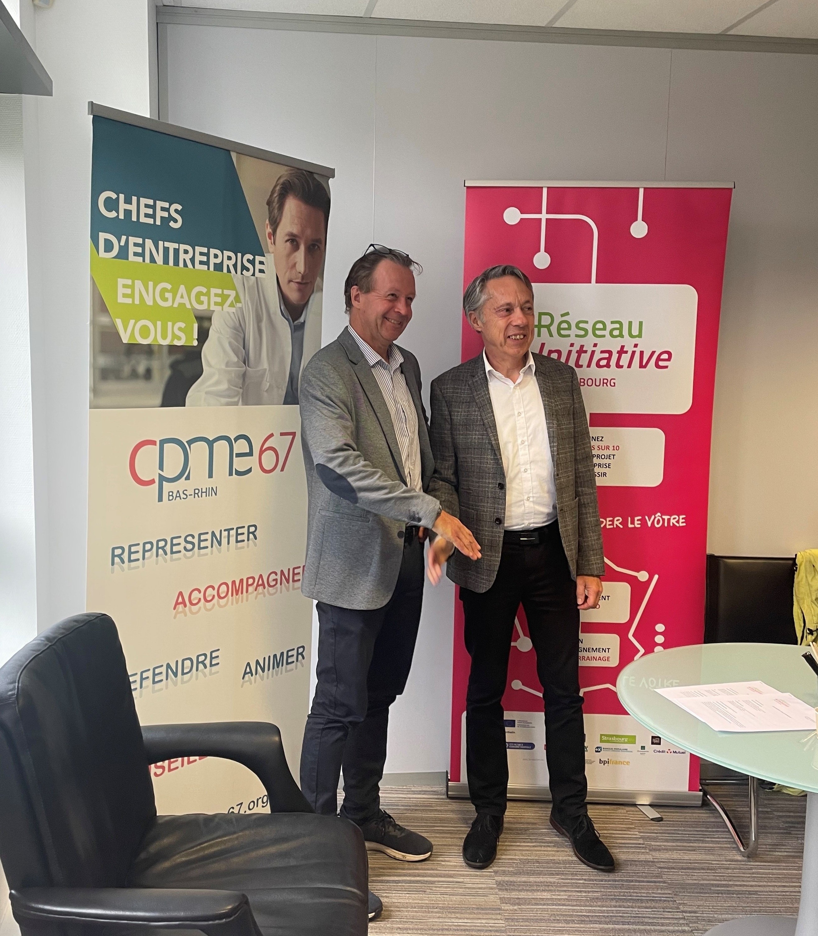 Mercredi 08 octobre 2025 Guy TONNELIER, président d’Initiative Strasbourg et Olivier LANG, président de la CPME 67 (confédération des petites et moyennes entreprises) se sont retrouvés dans les locaux de la CPM67 à Schiltigheim pour signer une convention de partenariat.